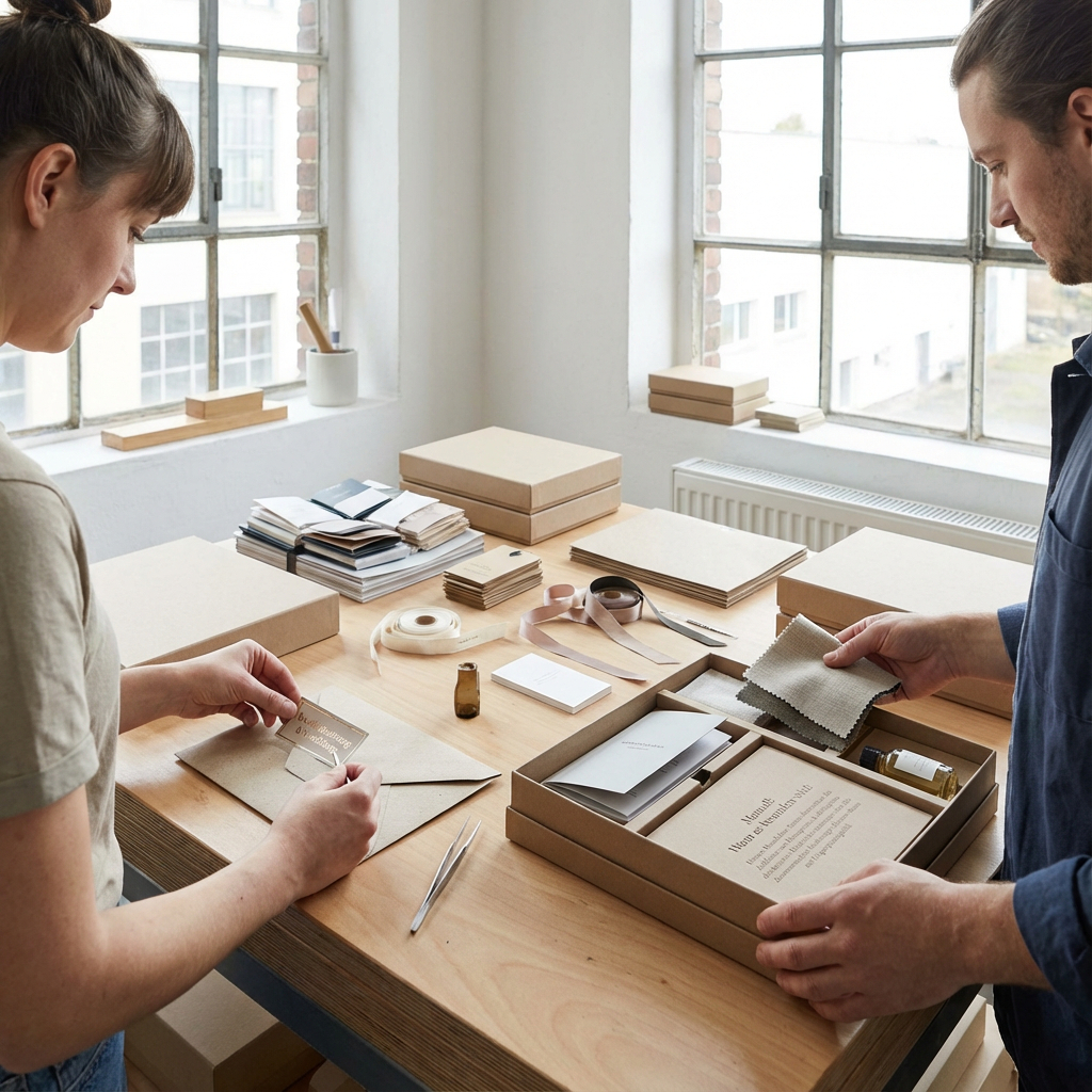 Manuell: Wenn es besonders wird. Unsere Manufaktur-Teams übernehmen das Aufkleben von Warenproben, das Beilegen von Mustern oder das Zusammenstellen hochwertiger Welcome-Boxen mit Fingerspitzengefühl.