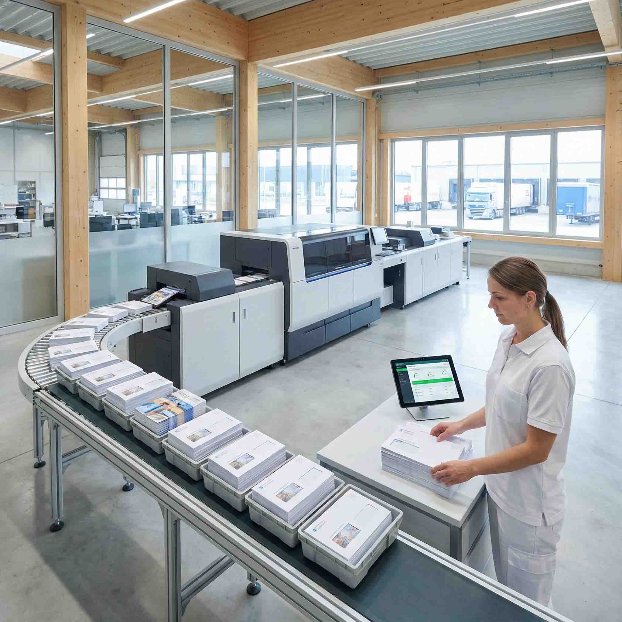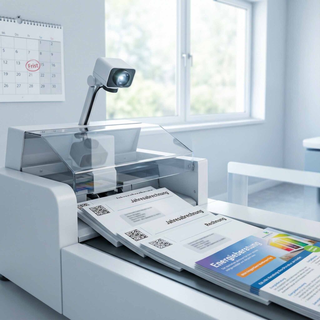 - Intelligentes Matching: Unsere Anlagen gleichen per Barcode-Scan jedes Blatt ab. Anschreiben, Rechnung und der Flyer zur Energieberatung werden garantiert dem korrekten Empfänger zugeordnet.