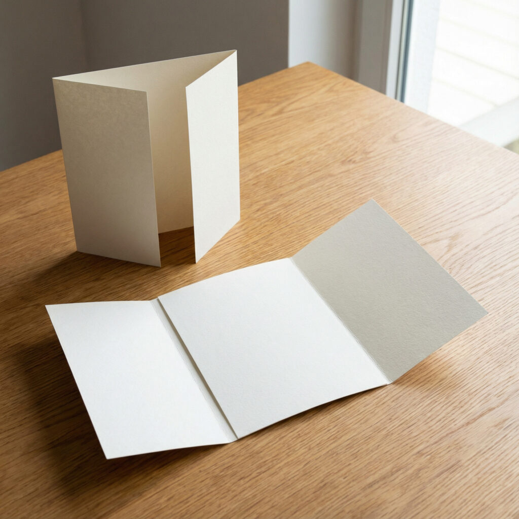 Ein einzelner Bogen wird so clever gefalzt (z.B. Wickelfalz oder Altarfalz), dass er verschickt werden kann.